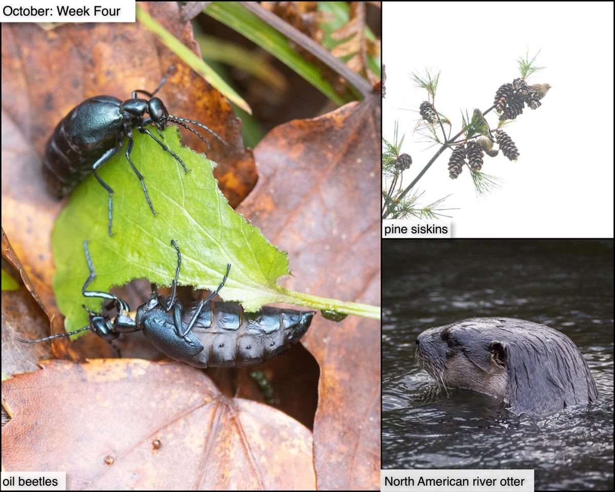 Another fascinating-and-disturbing fact about oil beetles is their relationship with solitary bees. In at least some species of oil beetles, the larvae swarm together to produce pheromones that attract bees, then hitch a ride on a bee to its nest, where they devour bee’s larvae – as described in this Invertebrate Bestiary column from the Summer 2022 issue of Northern Woodlands. (As shown in this photo, however, adult beetles prefer salad.)