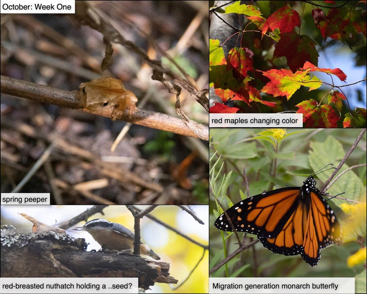 This week in the woods, we found a young spring peeper – perhaps two centimeters wide – crossing a trail by a wetlands. If you’re out at twilight, you may hear peepers now, although not in the thousand-voice choruses that fill the wetlands with sound on April nights. The reason for their autumnal calls – known as the “fall echo” – aren’t fully understood, but they’re likely a side effect of male peepers’ bodies preparing for spring, so that they can emerge from hibernation ready to mate. Here’s an article about the fall echo by Michael Caduto from our Outside Story archive.