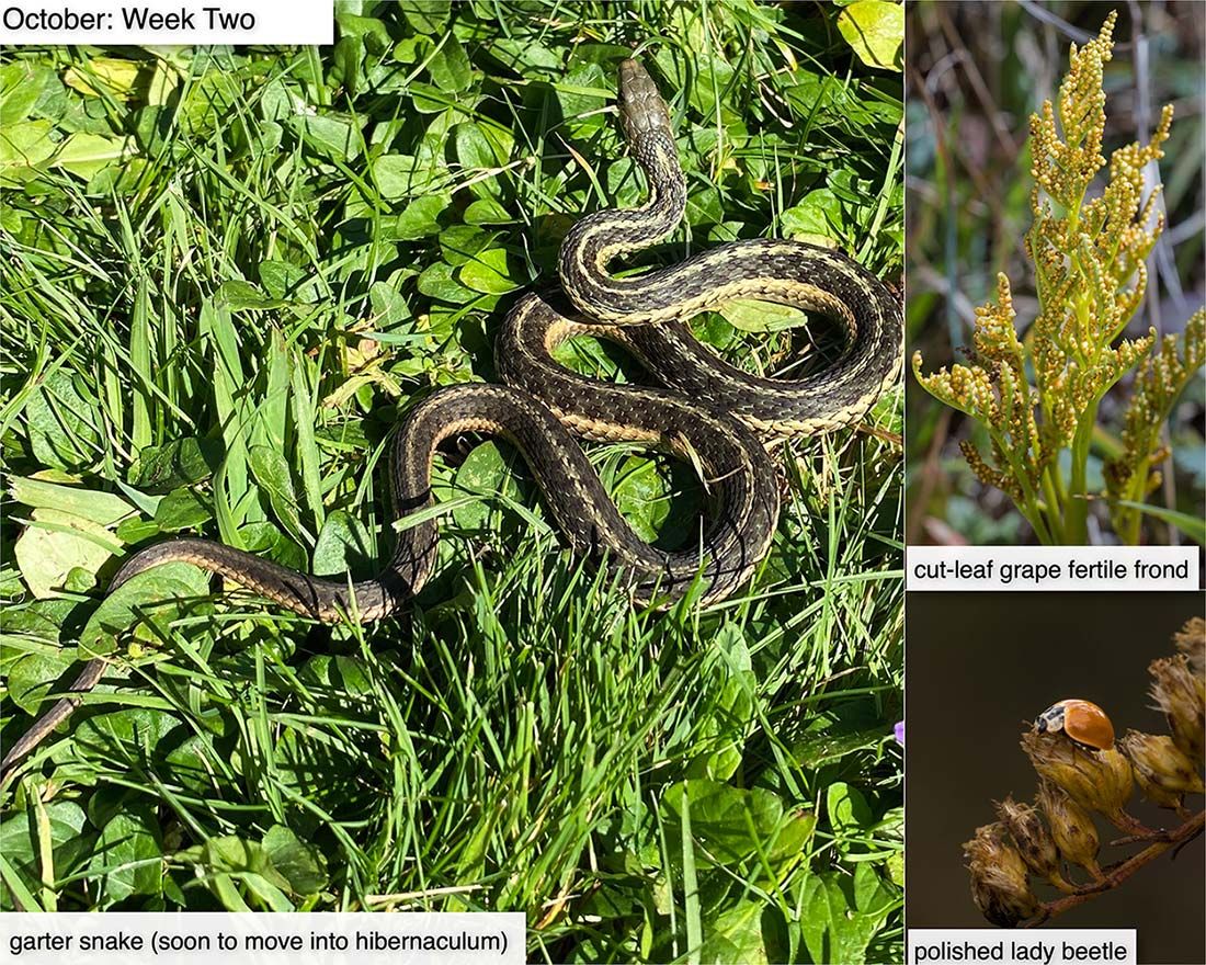 This week in the woods, Editor Meghan McCarthy McPhaul encountered this garter snake making its way across a field, perhaps on its way to winter lodging. The snakes typically move into hibernacula this month in rock crevices, rodent burrows, and other sheltered spaces. As noted in this Outside Story article by Sandra Mitchell, different species of snakes may share a hibernaculum; the critical requirement for the snakes is that the space be sufficiently under the frost line or next to radiant heat (a.k.a. your basement) that they won’t freeze.