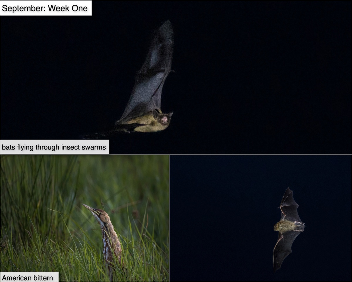 Bats are also present in large numbers around these insect swarms. This is a critical time for bats to build fat reserves in preparation for winter hibernation (most species) or fall migration (three species native to New Hampshire and Vermont). The top photo shows a bat in the moment before snagging an insect. Special thanks to Lucy and Turner Tillinghast, whose skilled flashlight work helped their father, Tig, take these photos.