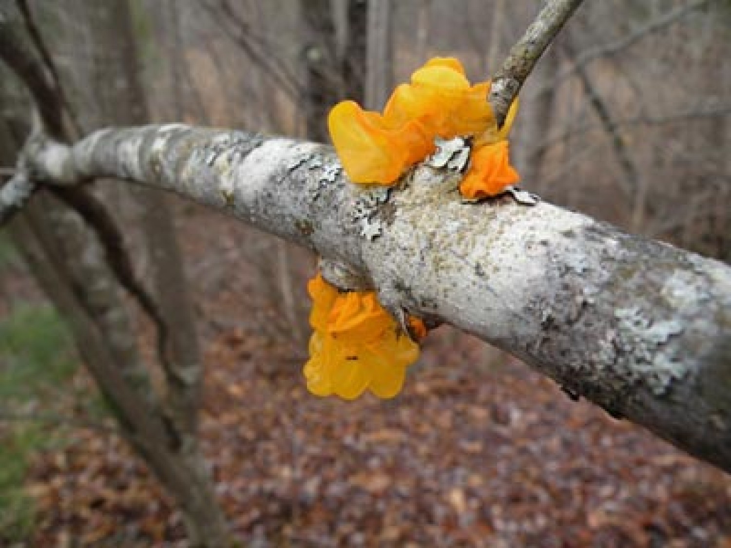 This blob is the fruiting body of witch’s butter, Tremella mesenterica or Tremella aurantia. Both of these species grow on decaying hardwood. A catch, though, is that witch’s butter is not decomposing dead wood, it’s parasitizing other fungi that are decomposing the dead wood. Witch’s butter can be found throughout the year during wet weather. It shrivels up when dry, but will resume its gelatinous form after the next rain.