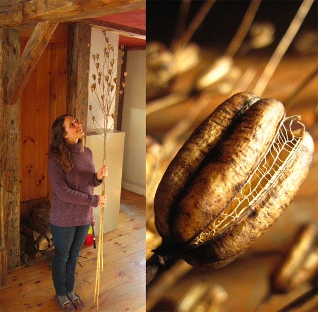 These tall stalks, topped with gorgeous oblongoid seed capsules, are the remains of last summer’s Canada lilies (Lilium canadense). Within each of the two-inch capsules are several stacks of large, flattened seeds. In June, these wildflowers will blossom, displaying one to five flowerheads in orange, yellow, or red.