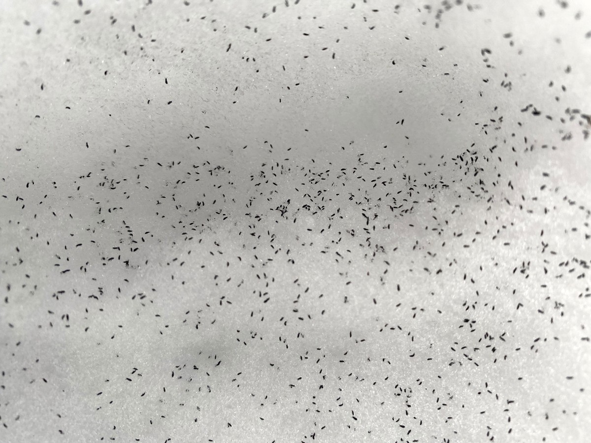 These are snowfleas, a.k.a. springtails, which Northern Woodlands’ Invertebrate Bestiary columnist Declan McCabe calls “the Tiggers of the invertebrate world” in this Outside Story essay, where he notes these tiny invertebrates often show up en masse in footprints and other depressions in snow.