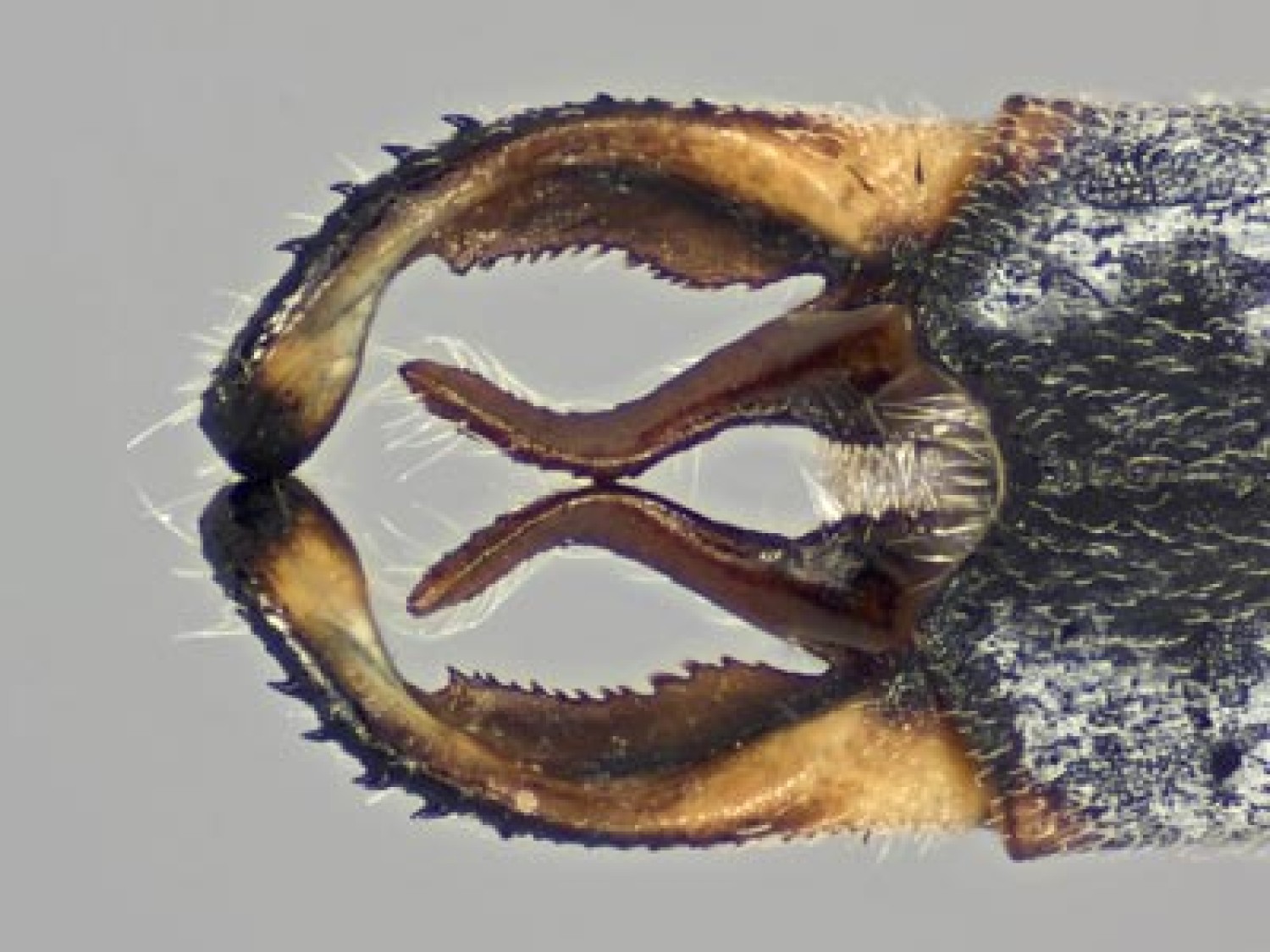The tail end of a male lyre-tipped spreadwing damselfly, Lestes unguiculatus.