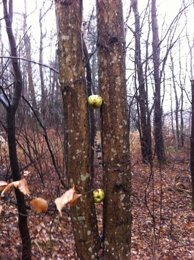 Forester and naturalist Lynn Levine snapped this picture last fall. In all, there were about 25 apples in the crooks of trees at different heights – 10 feet in the air, near the ground, and every height in between. “It looked like an Easter egg hunt,” she recalls.