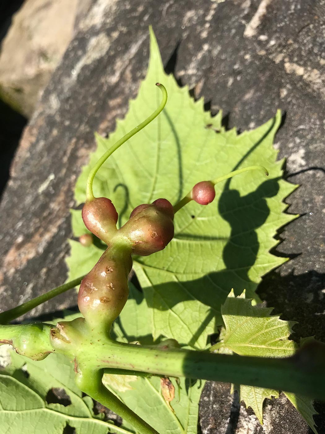 These are grape midge galls. They’re formed by tiny wasps (midges) in the genus Vitisiella. The galls form around the larvae as they grow. Larvae eventually emerge from these galls, drop off the vine, and burrow into the ground to pupate. You can learn more about grape midge gall wasps in this blog post by Charley Eiseman, recently featured in our Community Voices series.