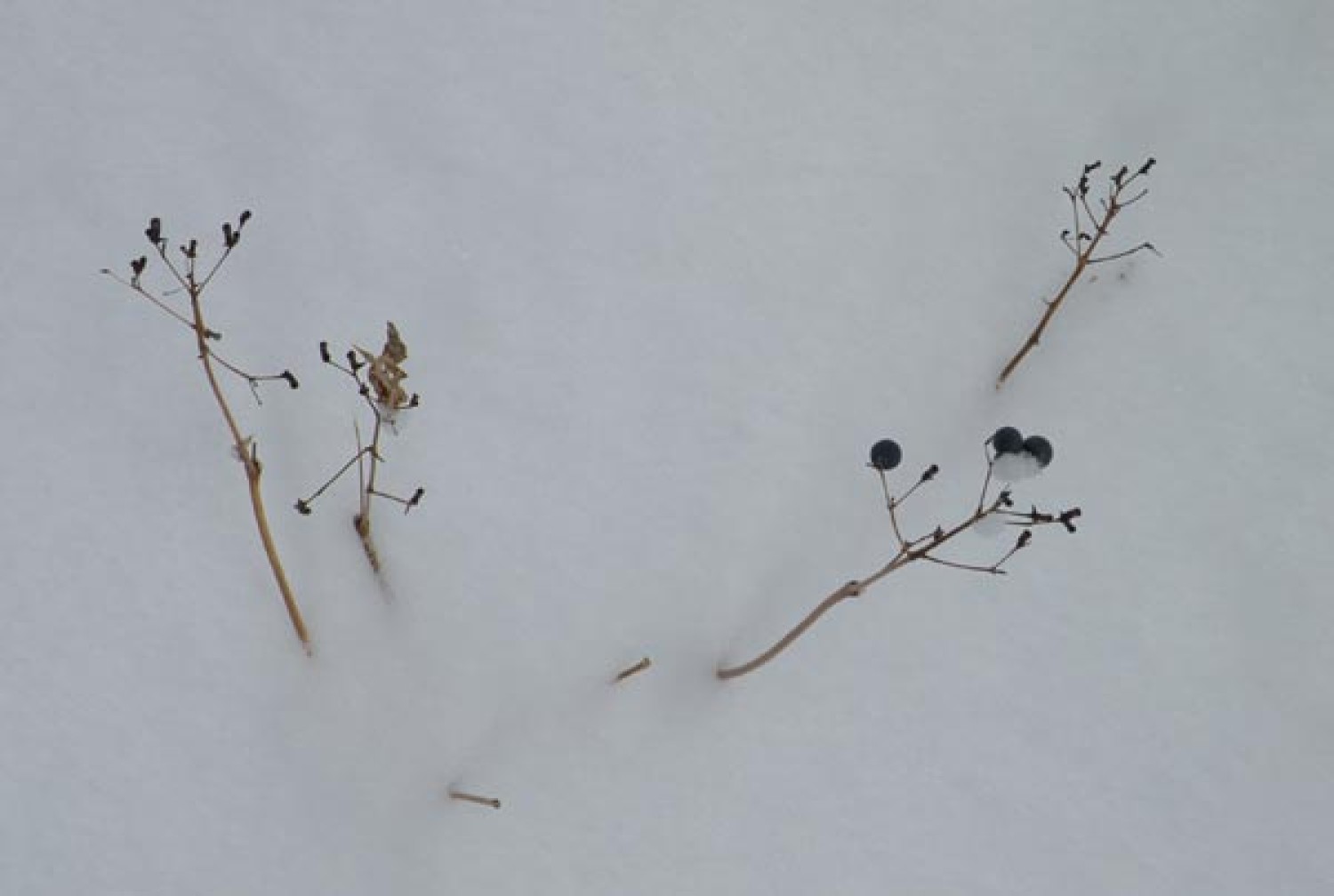 These blue berries belong to the plant blue cohosh (Caulophyllum thalictroides). If no berries are present, other telltale signs of this plant in winter are the somewhat hourglass-shaped flower stalks and a shiny, tan stem that bulges at the nodes (where the stem branches).