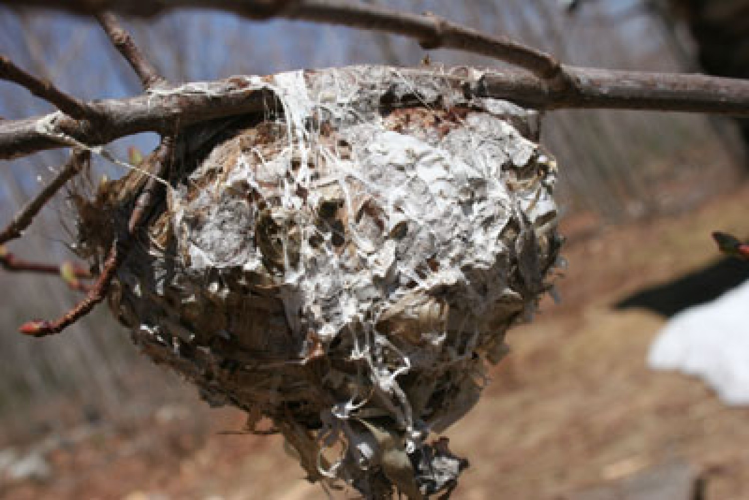 According to naturalist Bernd Heinrich, red-eyed vireos build their nests at any height but always in a deciduous tree. Their nests can be found in both forest and edge habitat. The nest is always a hanging cup suspended along its edges from a thin, horizontal, forked branch. It is a neat, tidy, compact structure that will have bits of birch bark, and usually also wasp paper, decorating the outside. The inside cup diameter of a vireo nest is 2 inches.