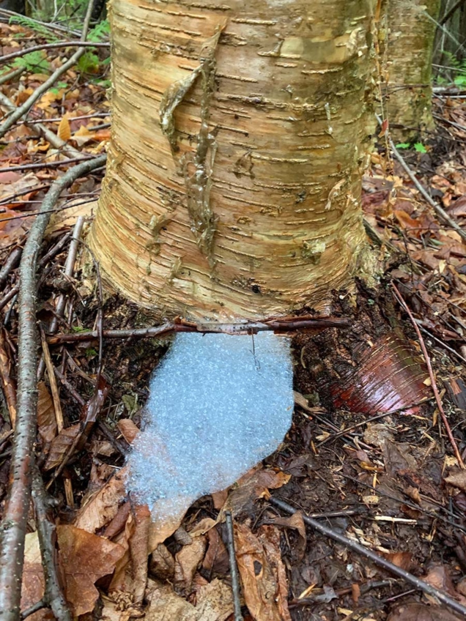 A reader in Stony Creek, New York, submitted this photo of a bubbly substance at the base of a yellow birch. What’s brewing here?