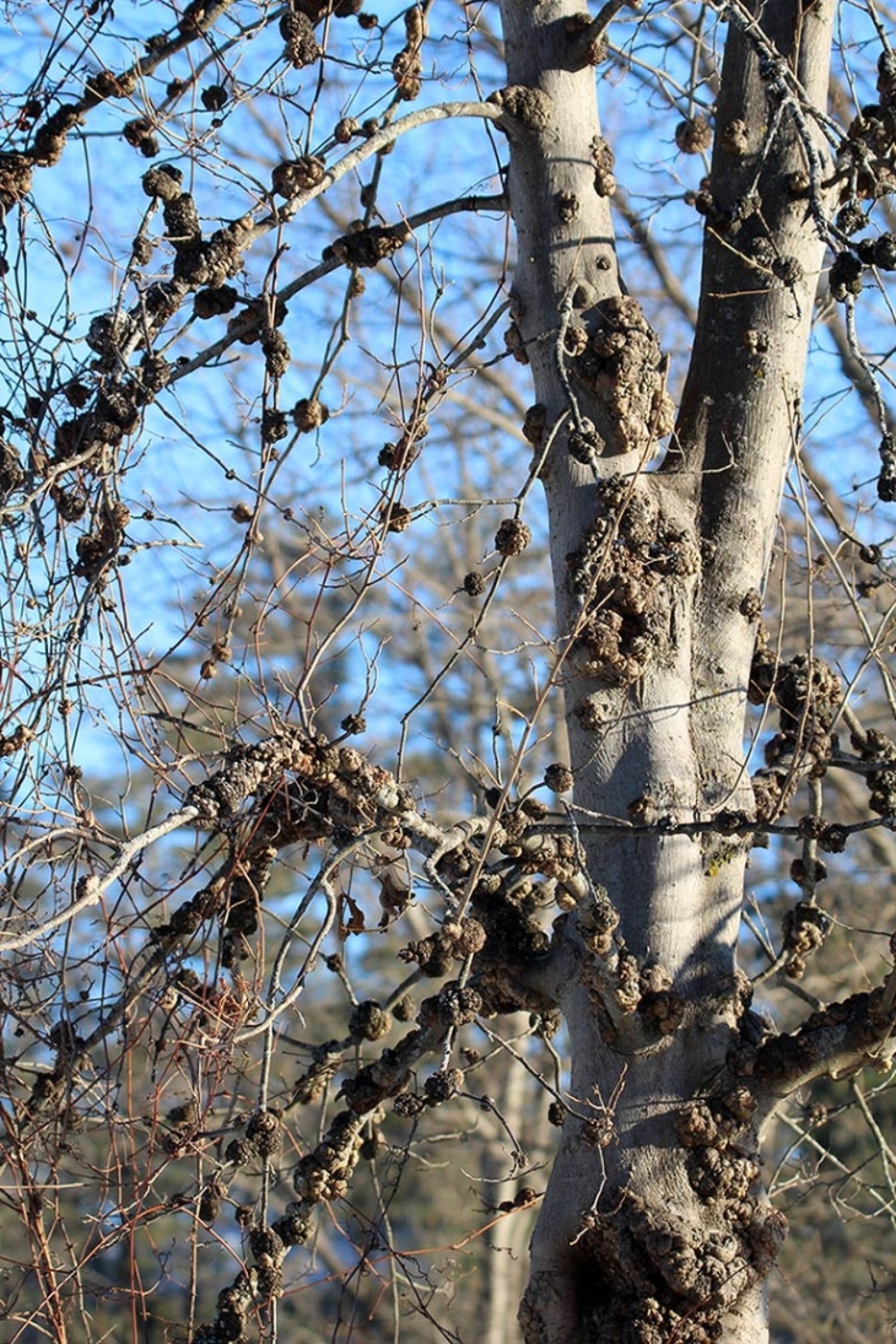 We spotted this bitternut hickory, bedecked in wart-like baubles, in Foley Park in Norwich, Vermont. What are all these bumps on the tree’s trunk and branches?