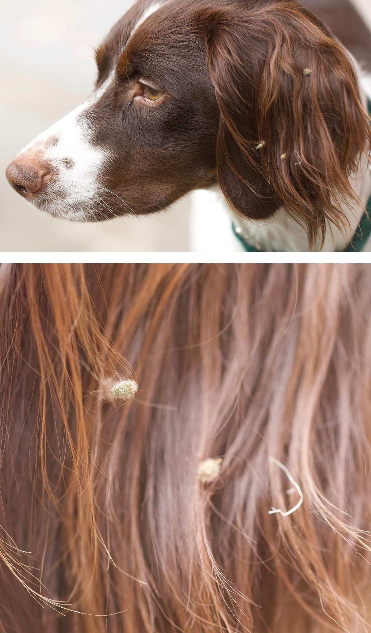 Like many woods-wandering dogs, this Brittany spaniel regularly returns from romps with small balls sticking to her ears. What are they?