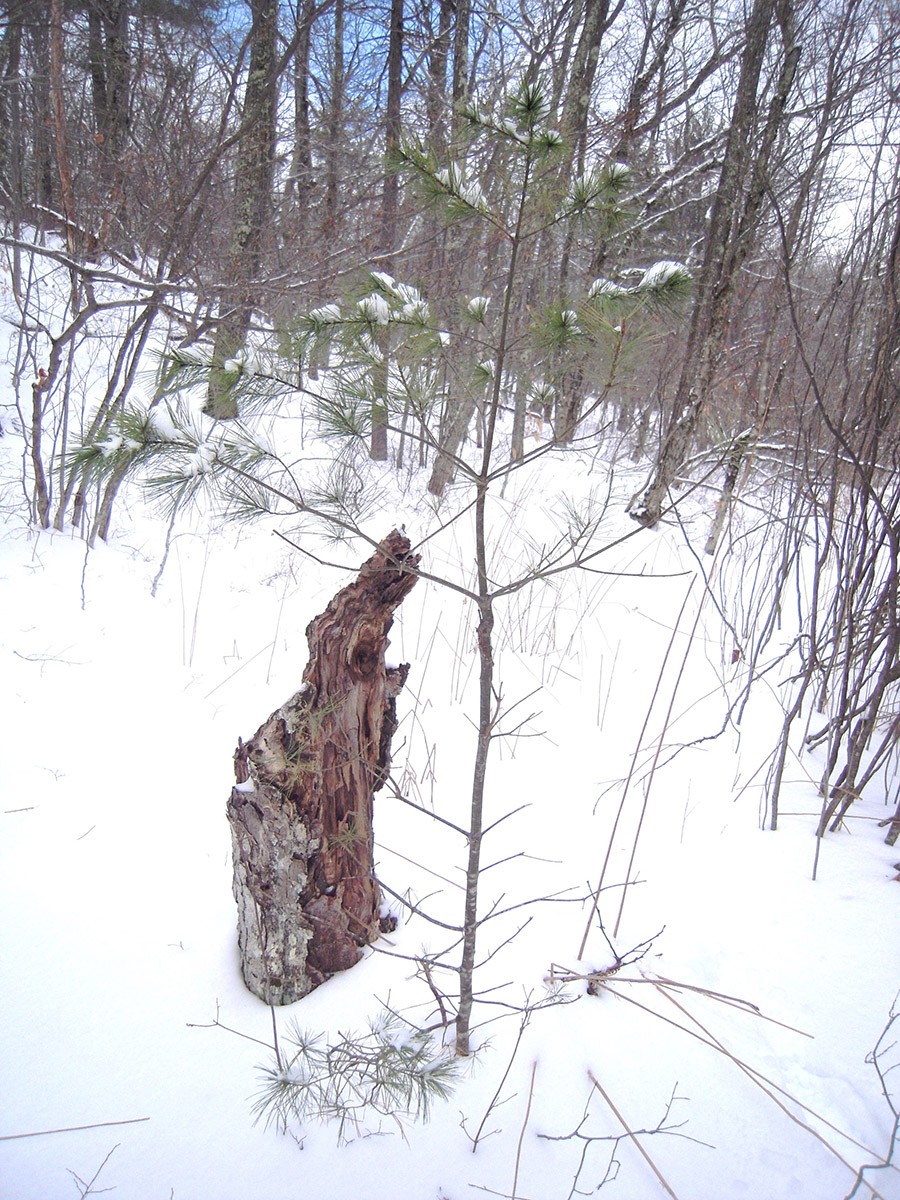 The making of a Charlie Brown tree: this white pine was observed among a thicket of shrubs on a wet site. In addition to the shade and wet soil, what other major factor has limited the growth of this tree?