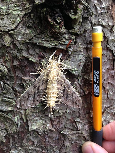 We asked Barbara Schultz, forest health program manager with the Vermont Department of Forests, Parks & Recreation, for a remote diagnosis. She believes the moth is infected with an entomopathogenic fungus. “The fungus may be one of the species in the genus Cordyceps, which is one of the more common insect-killing fungi that you can see without a microscope,” she explained.