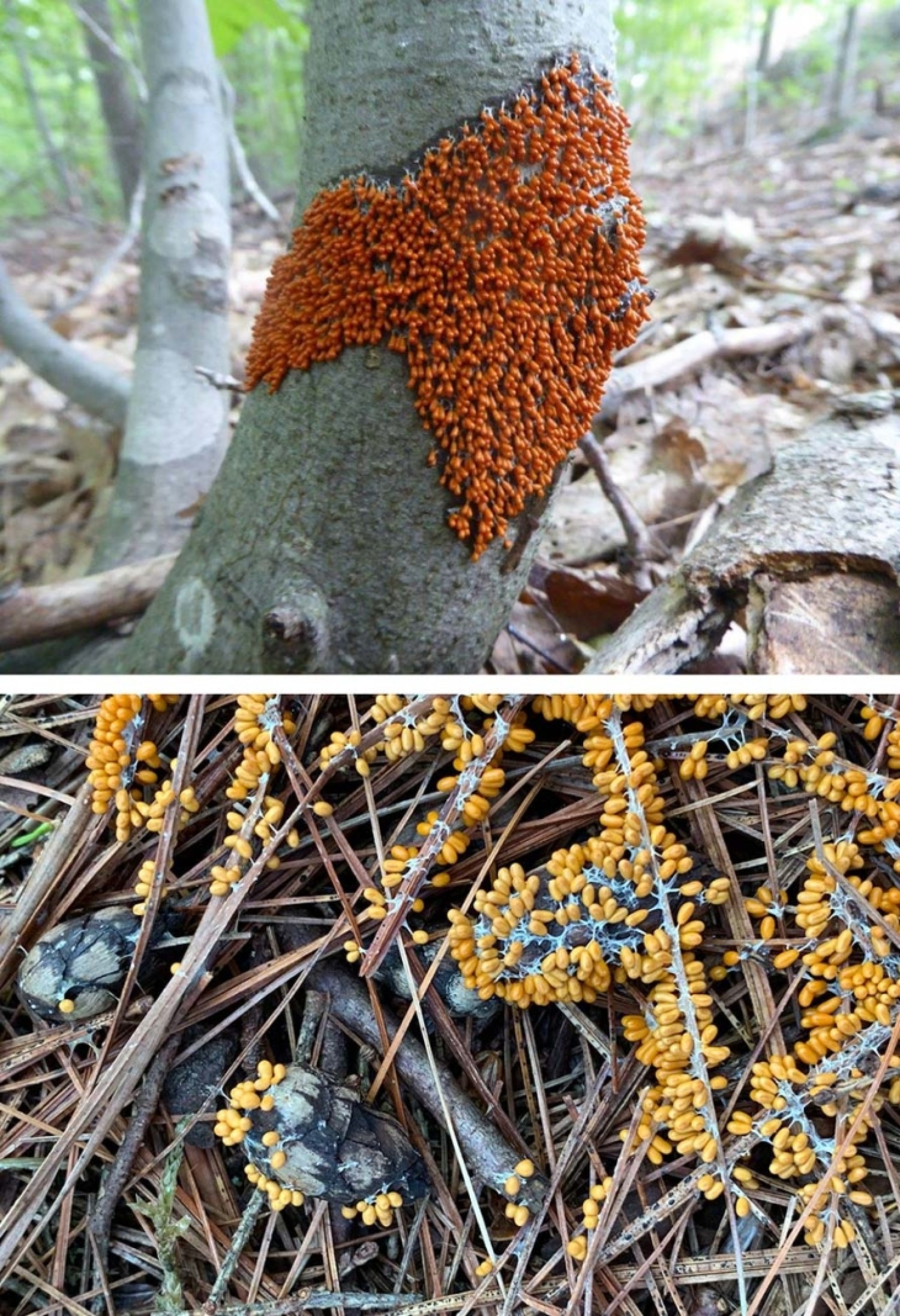 Reader John Ford of Laconia, New Hampshire, shared the top photo of “strange deposits on a beech tree” the same day Jim Cummings of Kennebunk, Maine, sent in the bottom photo of a similar phenomenon beneath a stand of hemlock trees. What is this?