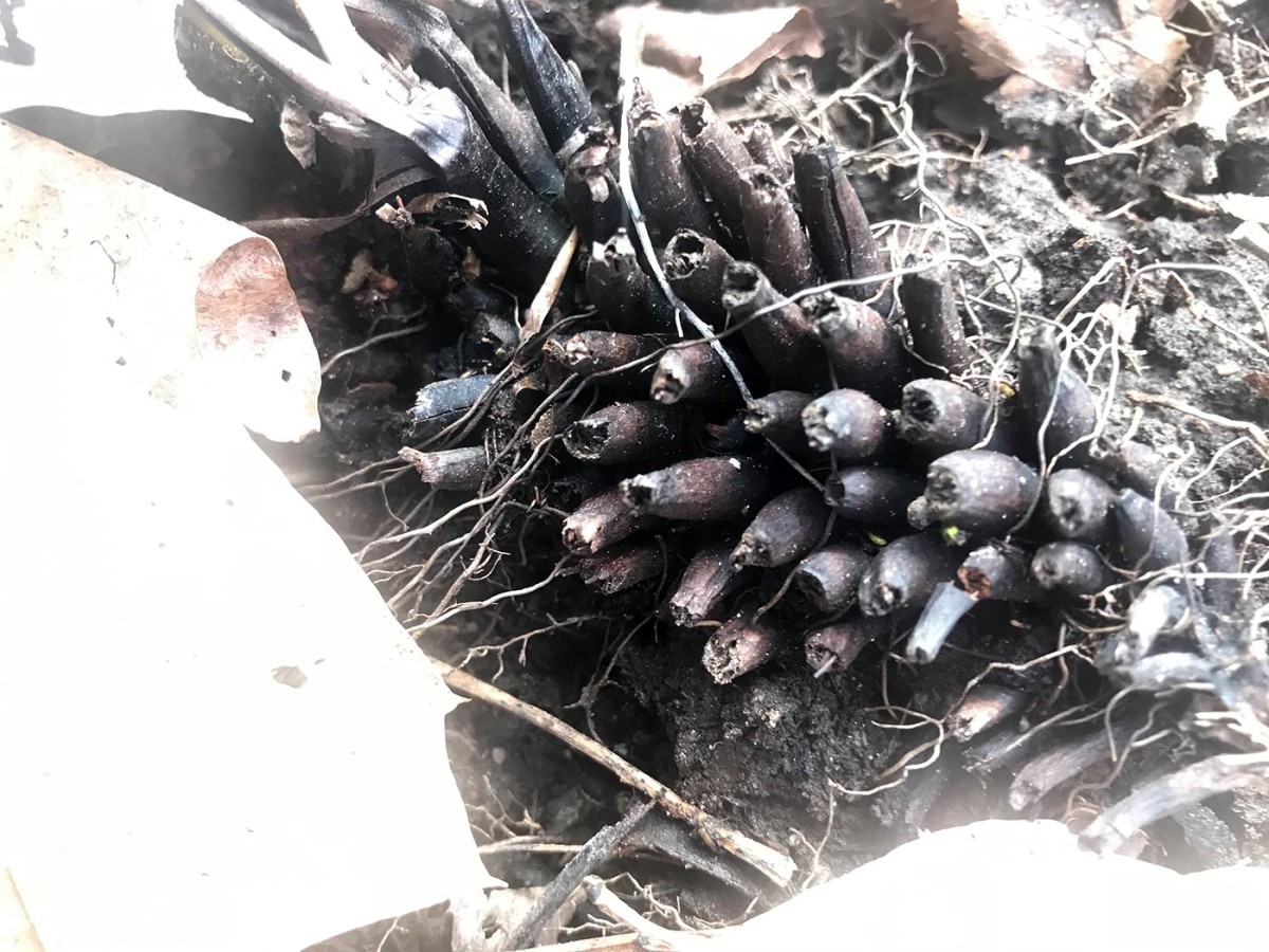 This is the rhizome of a Christmas fern. This fern’s rhizome typically grows horizontally underground and produces roots below and new fern shoots above.