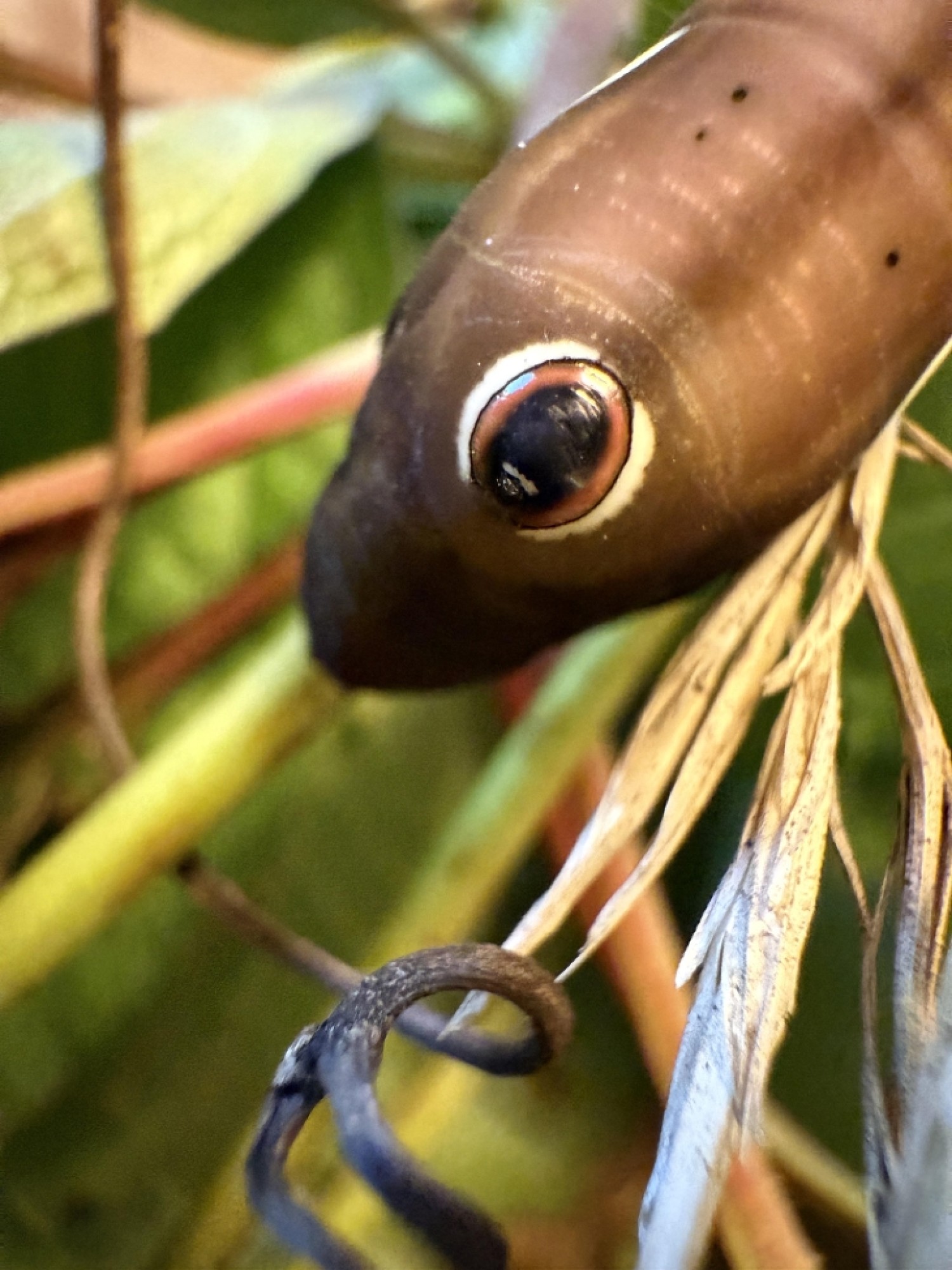 The false eye on a Pandora sphinx moth caterpillar serves as a defense mechanism; its size tricks predators into thinking the caterpillar is a larger creature. Pandora sphinx moth caterpillars can be found feeding on plants in the grape family.