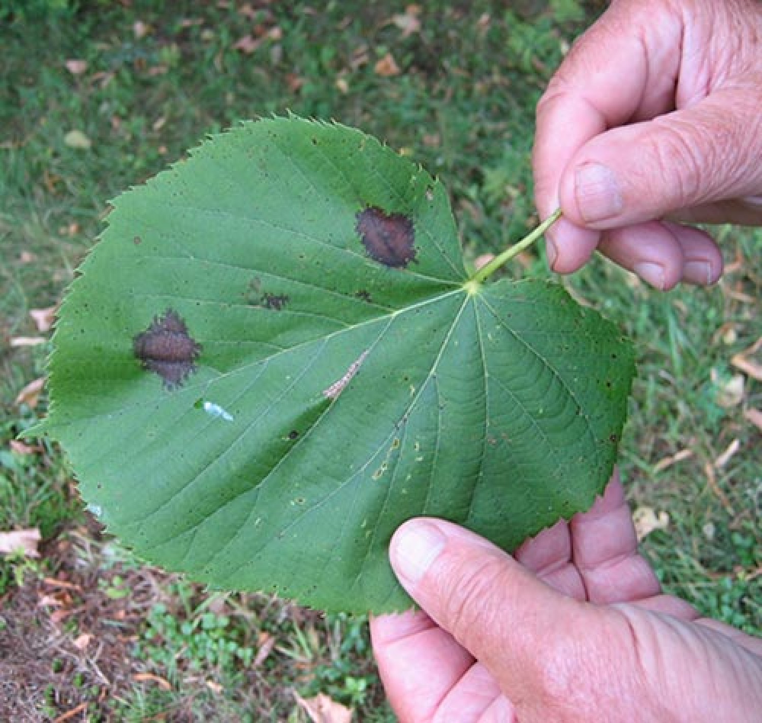 Linden leaf blotch on a basswood leaf. (Basswood is a close relative of lindens, which are common landscaping trees.) Although it looks like the more recognizable giant tar spot, which is a common disease on Norway maple, giant tar spot does not affect basswood.