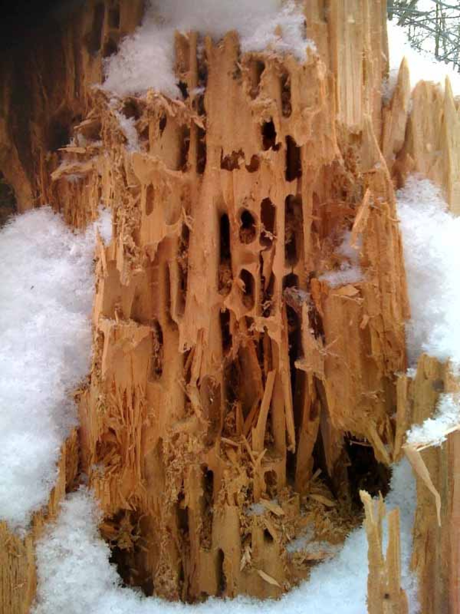 Reader Penny Harris from Cambridge, Vermont lost an enormous white pine in a recent windstorm. This photo shows the inside of the snapped trunk. What caused these strangely shaped holes?