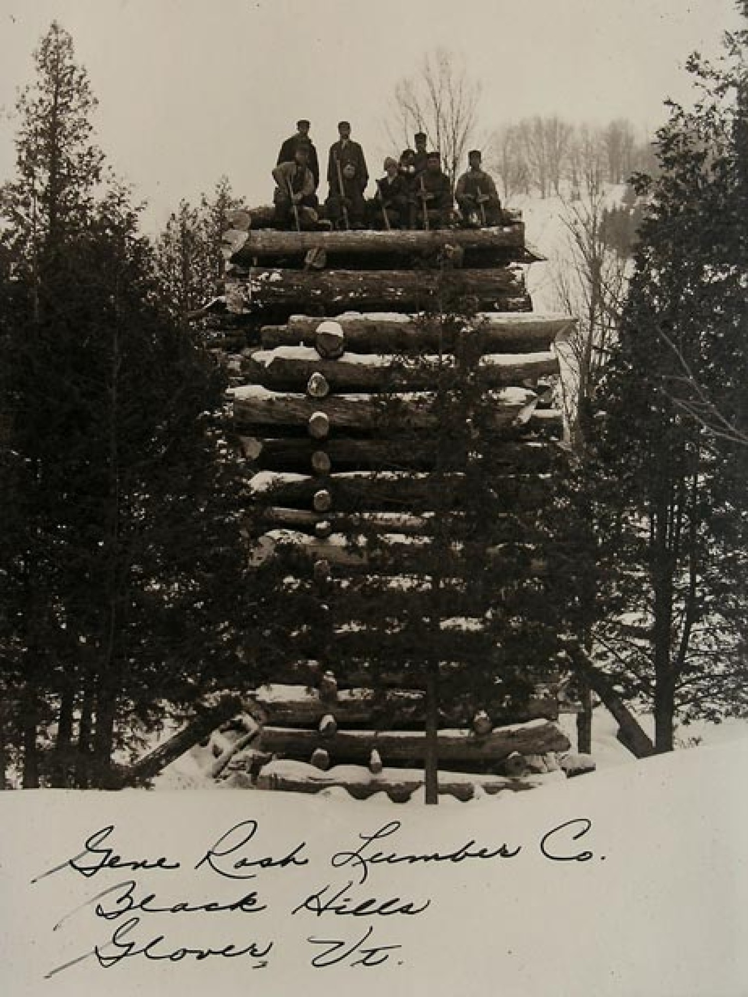 Things were starting to spiral out of control when Caledonia/Essex County Forester Matt Langlais sent along the additional picture you see here. It’s from a postcard entitled Glover loggers, and perched on top seem to be the same eight loggers and the same dog. It seems reasonable to assume that this is the side view of the same log pile, which would indicate that the cribbing was nothing more than the end of the pile – the logs crisscrossed in this manner just like you’d block a free-standing wood pile.