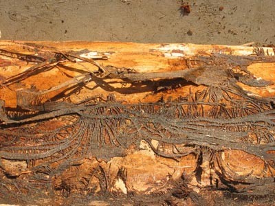Reader Karen Jackson was loading her woodstove when this piece of bark fell off a log. The underside was covered in lacy designs. What caused these patterns?