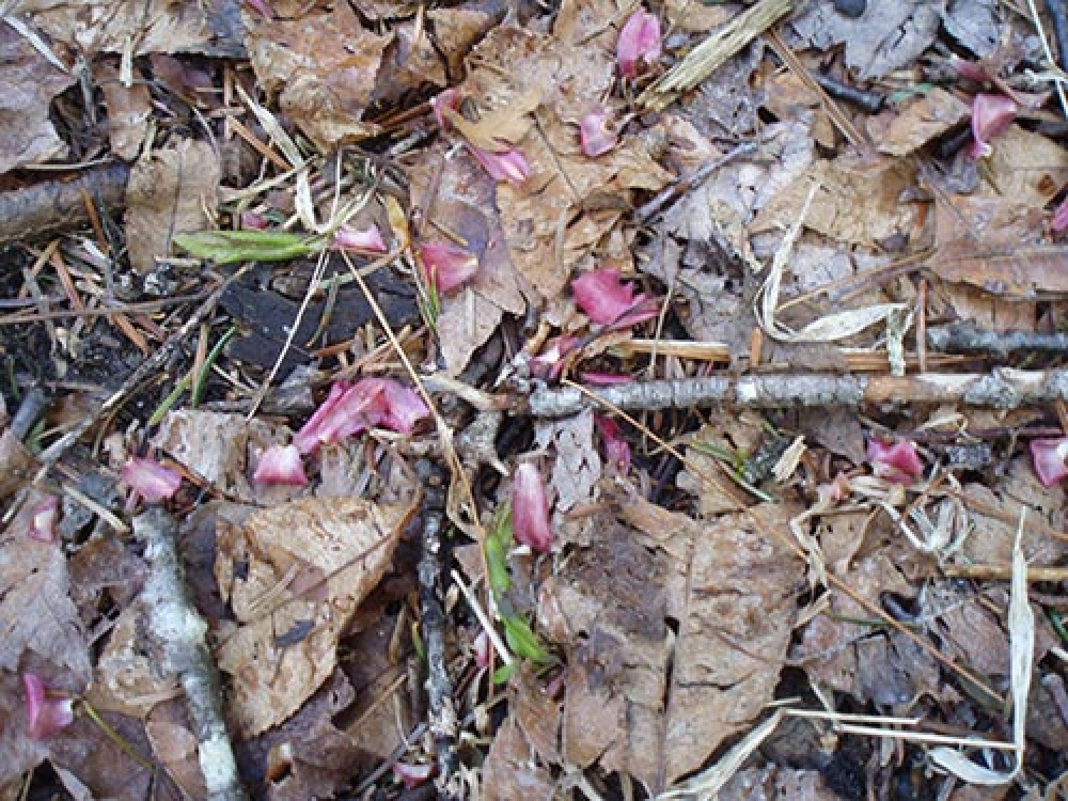 Red petals decorate the forest floor in Windham County, Vermont, on Memorial Day weekend. What are they?
