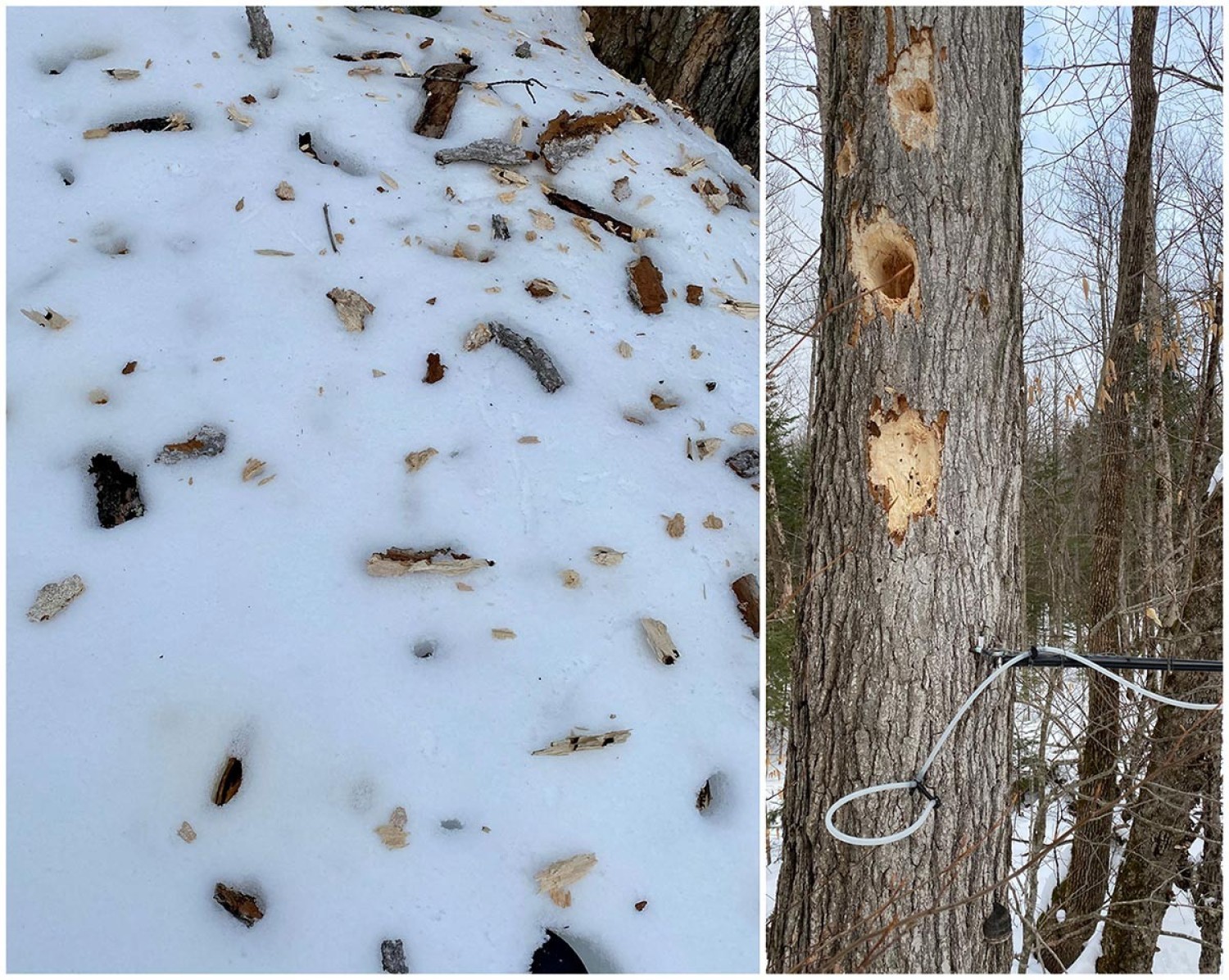We found these splintery wood chips scattered across the snow beneath a sugar maple in a Sugar Hill, New Hampshire, forest. What happened here?