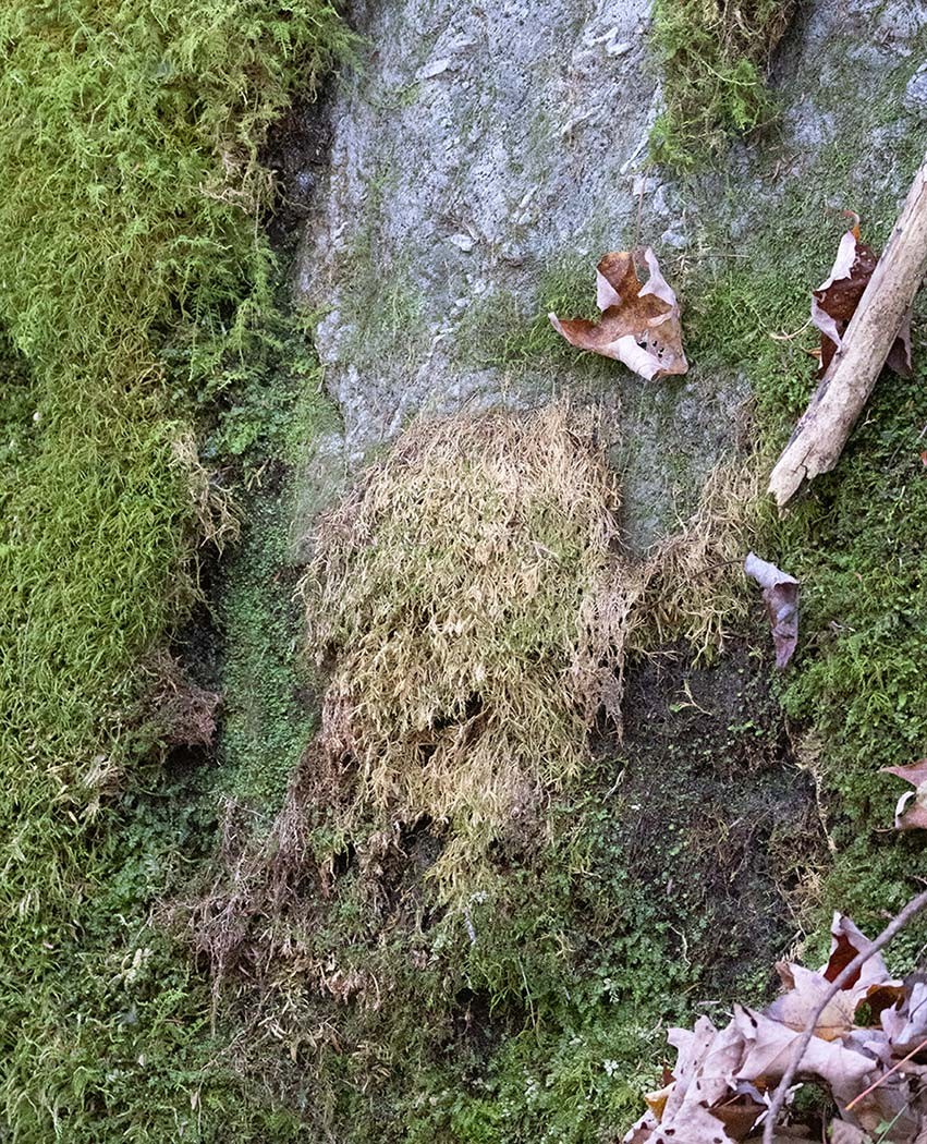While out walking on a little-used woods trail beneath a steep cliff in central Vermont, we found this patch of yellow moss attached to the vertical rock face at the base of the cliff, surrounded by green moss of the same species. Closer inspection revealed that some of the moss had been rubbed away, and there were scratched up leaves below this spot. What’s going on here?