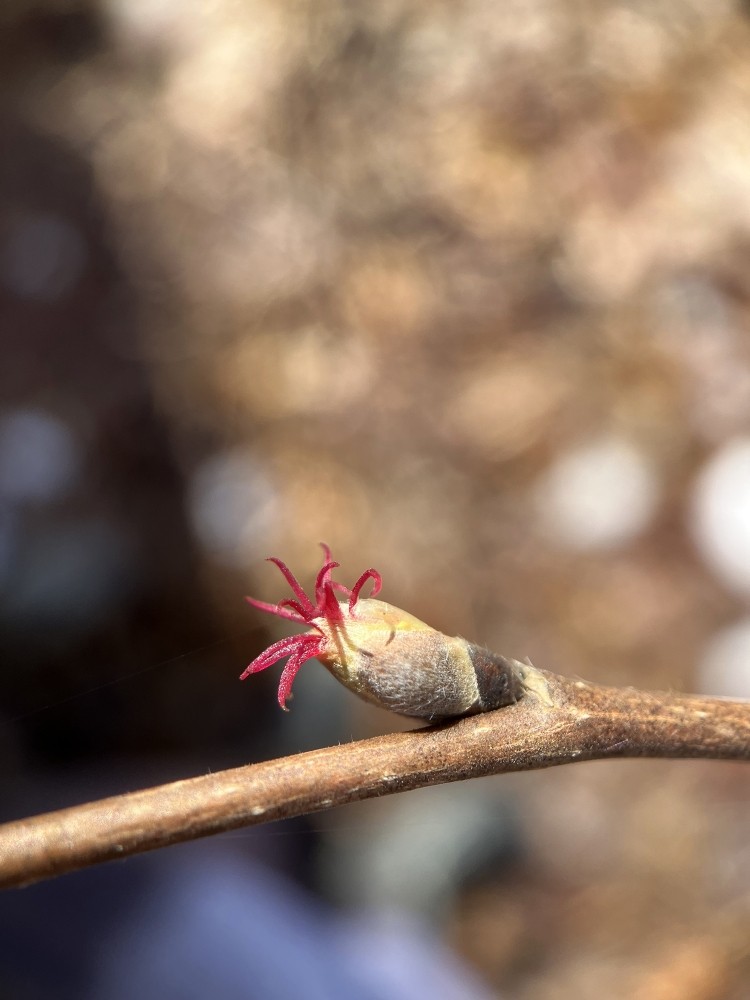 These are the magenta stigmas of beaked hazelnut (Corylus cornuta), which can be found in upland forests around the Northeast. This time of year, it’s easiest to spot their yellow catkins from a distance, and check for the stigmas when you get closer!