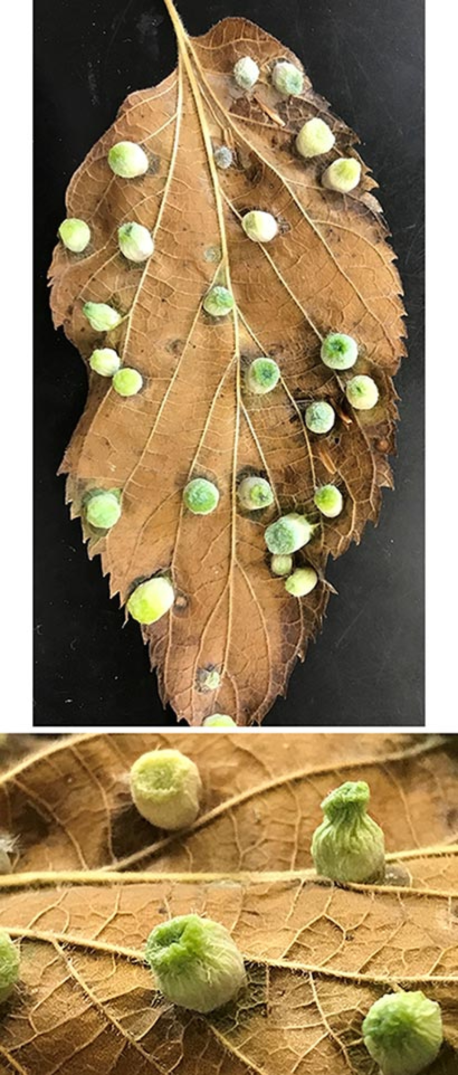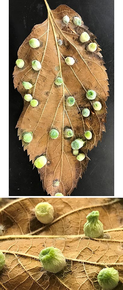 Hackberry nipple galls, which are growing on the undersides of leaves. Adult hackberry gall psyllids (Pachypsylla celtidismamma) are 1/10-inch long insects that lay eggs on hackberry leaves as they break bud in spring. The leaves respond to chemicals released by the hatchling larvae to grow galls in which the insects live and feed until they emerge as adults in fall. Thanks to Declan McCabe for passing along the photo and information.