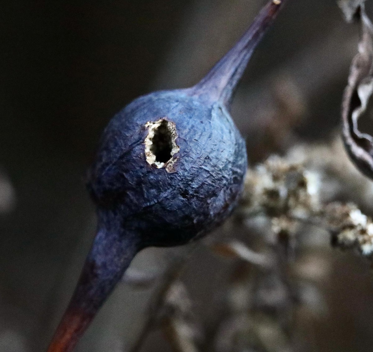 This goldenrod ball gall has been pecked by a bird hoping to make a meal of the larval goldenrod gall fly (Eurosta solidaginis), which overwinters in the gall.