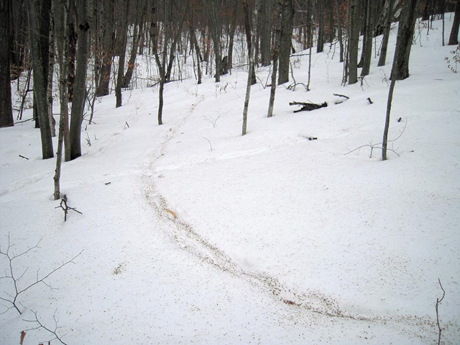 Those are wind-blown birch seeds in the depression of an old deer track.