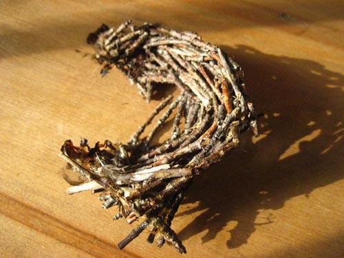 This nest was found in a homeowner’s fireplace after having fallen from the chimney. Chimney swifts use bits of twig and their own saliva to build nests that secure to the inside of chimneys (or hollow trees, or other structures). You’ll notice the flat edge on one side of the nest; that’s where the nest was attached to the chimney. Unfortunately, these nests can fall, sometimes with babies still in the nest! Be sure to read more about the rescue of chimney swift babies and the work being done to save this declining bird here.