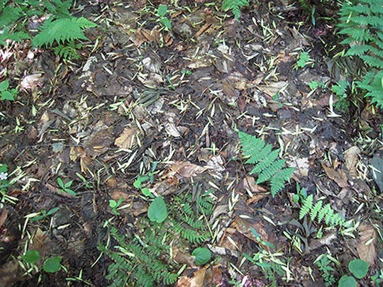 What are these small, skinny, pale green objects scattered on the forest floor?