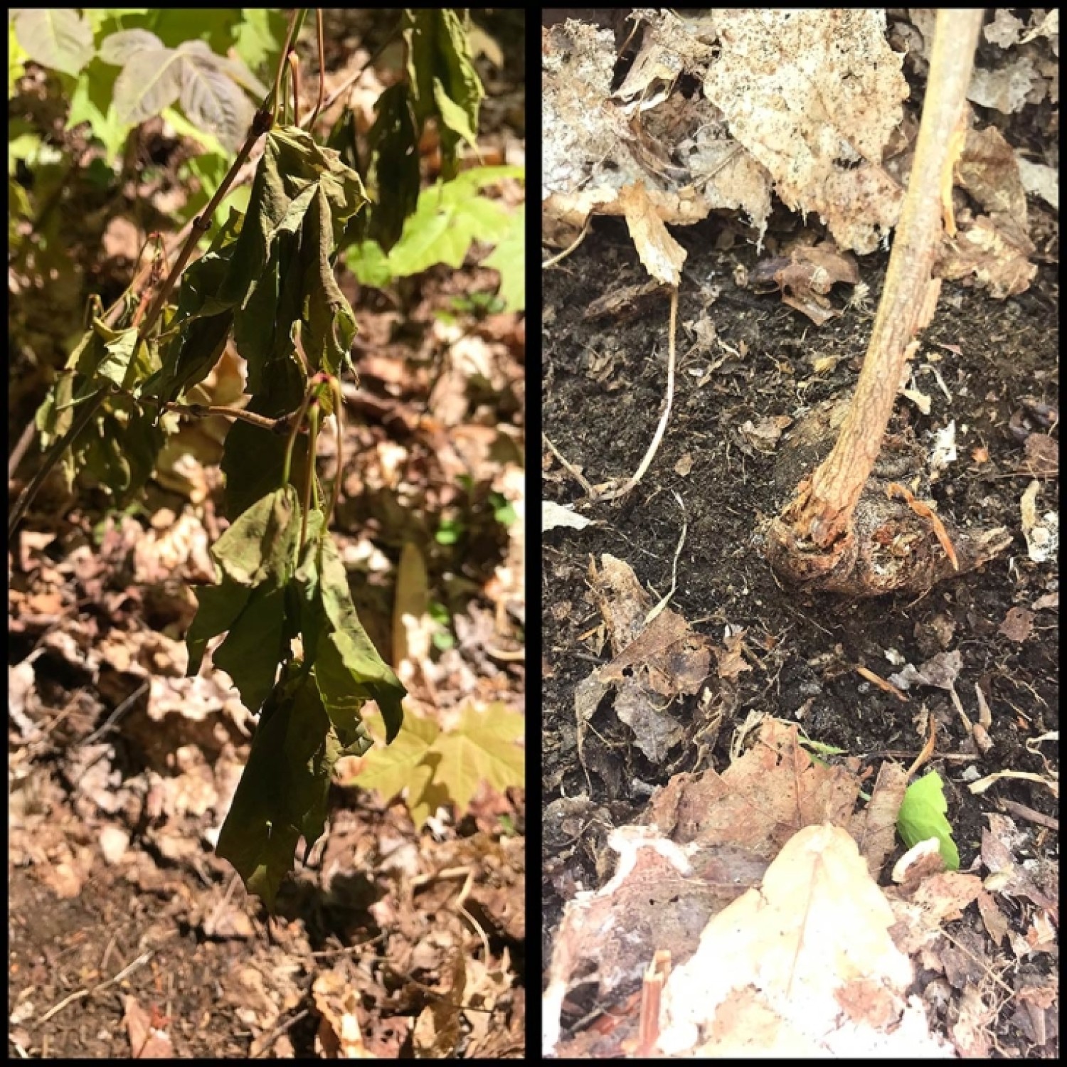 On a recent walk through a woodlot in Greensboro, Vermont, friends encountered a healthy patch of sugar maple seedlings, but one tree (left) appeared to be dying. Closer inspection showed multiple holes in its root collar (right). What caused this damage?