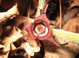 Wild ginger, Asarum canadense. The unusual, maroon flowers can be hard to see, as they’re typically hidden by the foliage of the plant.