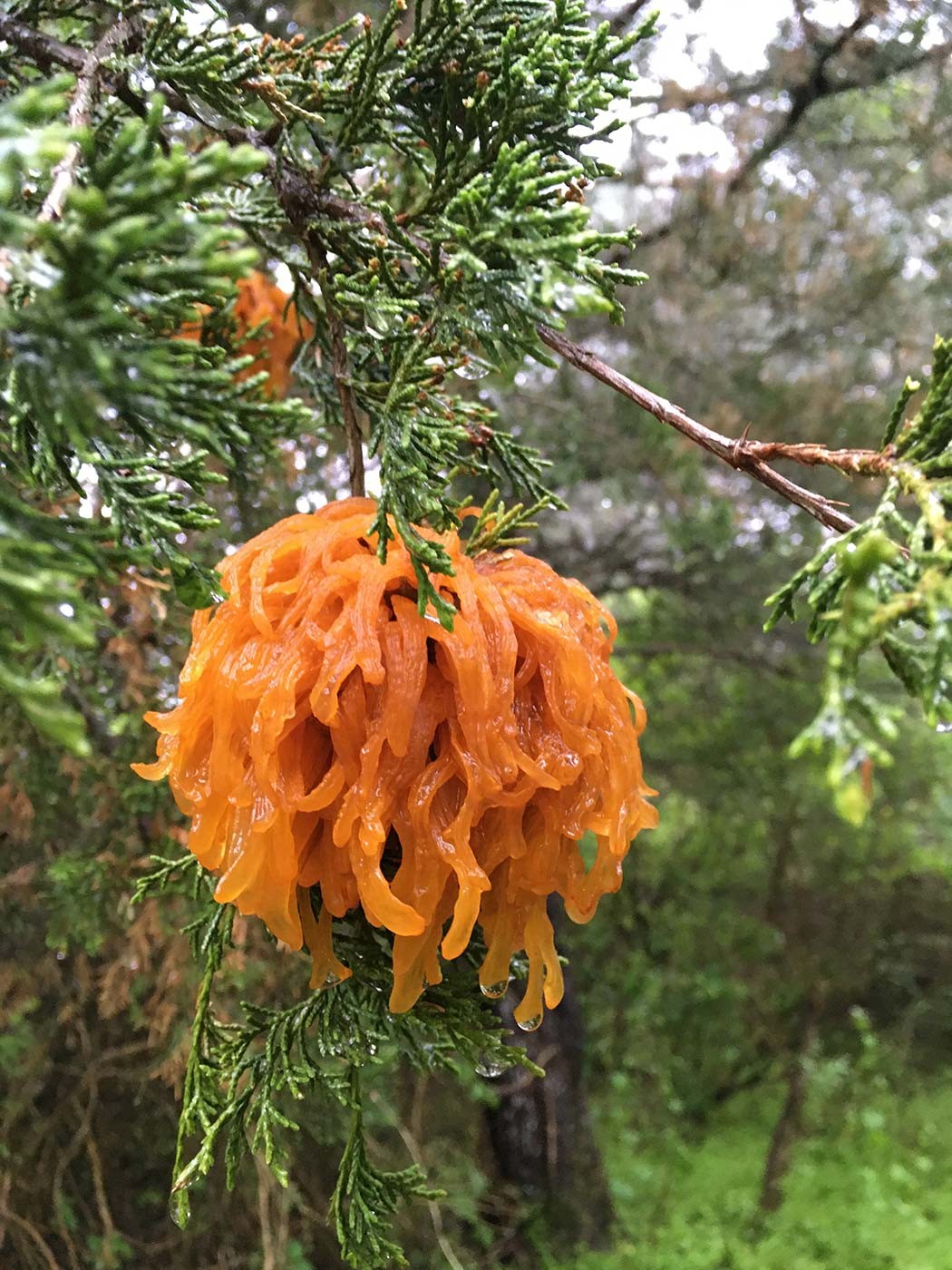 That’s cedar apple rust, a funky-looking fungus, but one that rarely causes much damage to host trees. Check out this post from the University of Minnesota for more information.