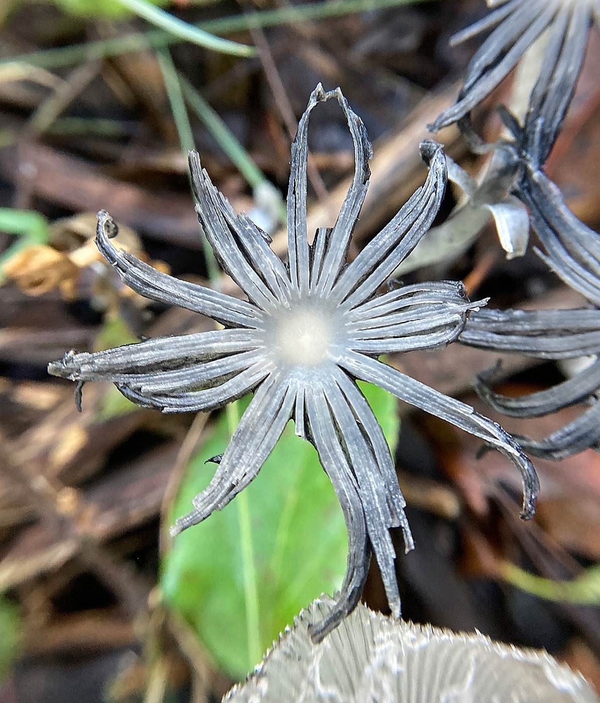 This is a hare’s foot inky cap mushroom (Coprinopsis lagopus) near the end of its deliquescence – a process in which the mushroom self-destructs by producing enzymes that liquify its cap and gills, which results in the release of spores. “Inky caps are famous for deliquescing,” said Kirk. “What you are seeing in the photo is the space between the gills, because the gills are gone/have liquified.” For more information about this mushroom, check out this write up on MushroomExpert.com by Michael Kuo or this United Kingdom-based Mushroom Diary.