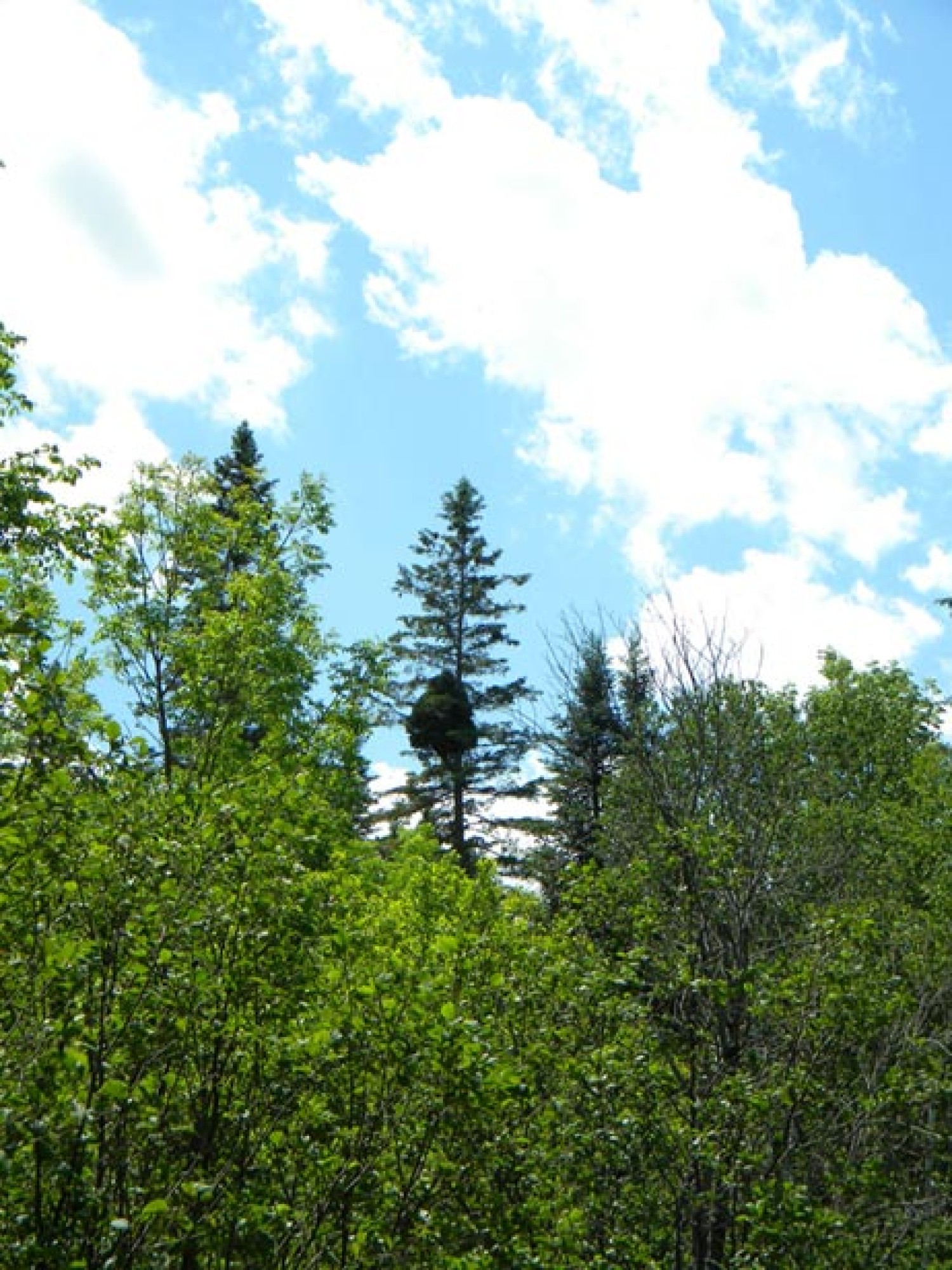 Though witch’s broom is the common name for tree deformities like this, what’s causing the broom is a more complicated question. It could be eastern dwarf mistletoe, a parasitic plant, but we have our doubts. According to the forest pathologists we spoke to, mistletoe brooms usually occur in bunches, and there are no other brooms on this tree or any others nearby.