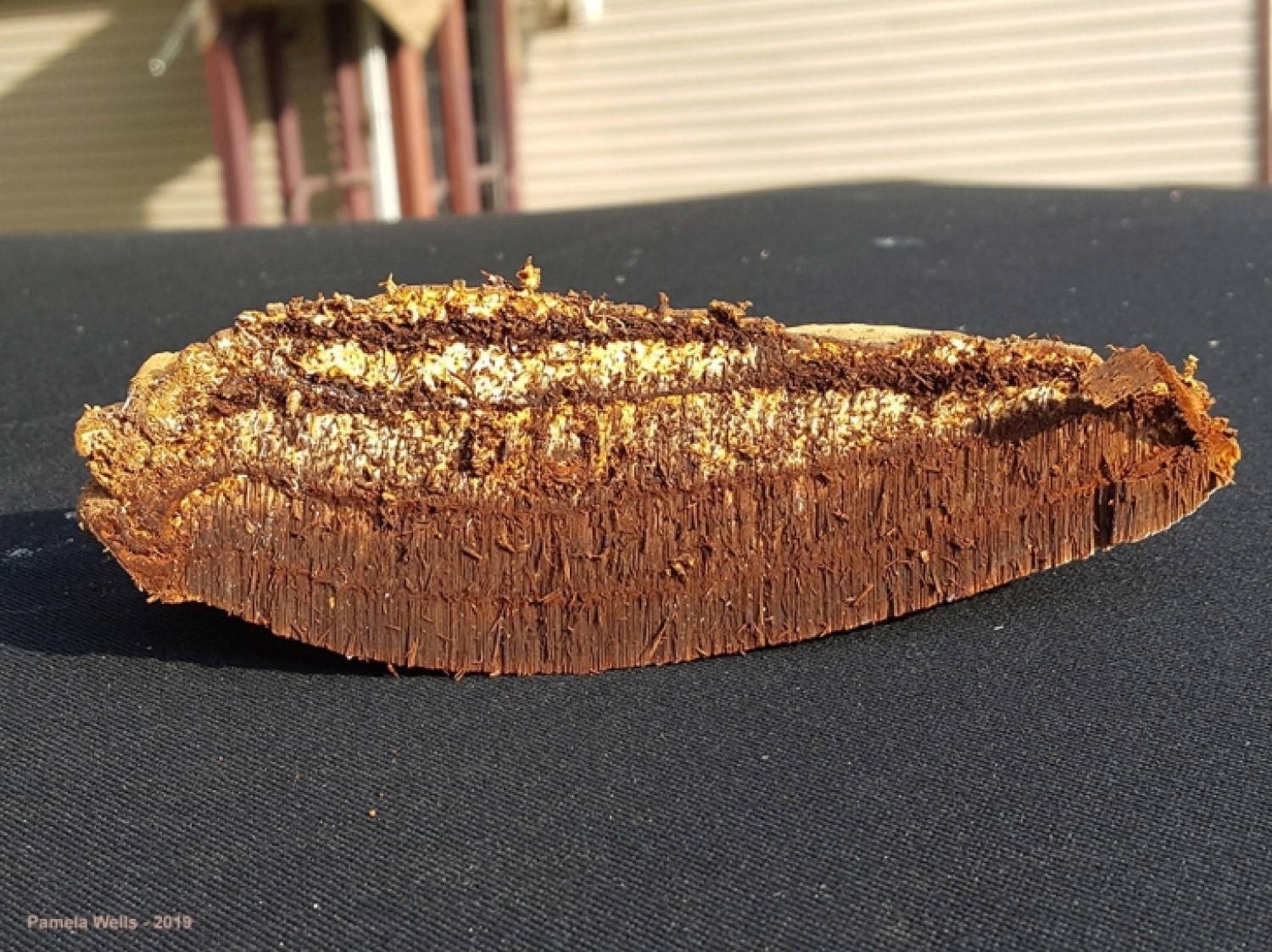 “I found this huge thingy in the remains of an old maple stump in my yard,” explains Pamela Wells. The accompanying photo shows a cross-section; what is it?