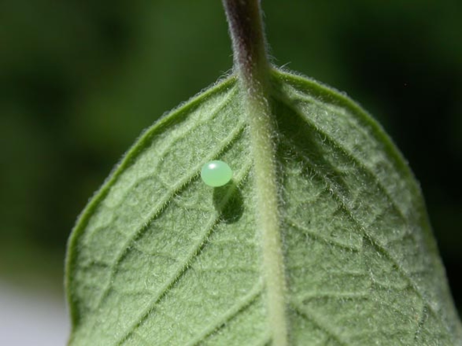 This is the egg of a Canadian tiger swallowtail butterfly (Papilio canadensis).Females lay eggs singly on the leaves of host plants. When the larvae emerge, they eat the leaves of their host plants, which include ash, poplar, willow, and cherry.