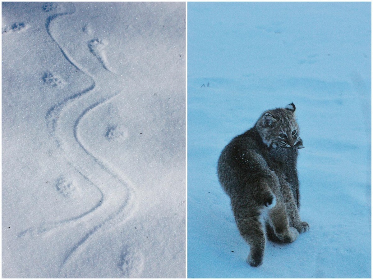 A bobcat wrestled a gray squirrel to secure its next meal, then carried the squirrel into the woods. The squirrel’s hind legs dragged in the snow between the bobcat’s tracks, creating these parallel marks. (Picture updated to include the victorious bobcat with its unfortunate prey.)
