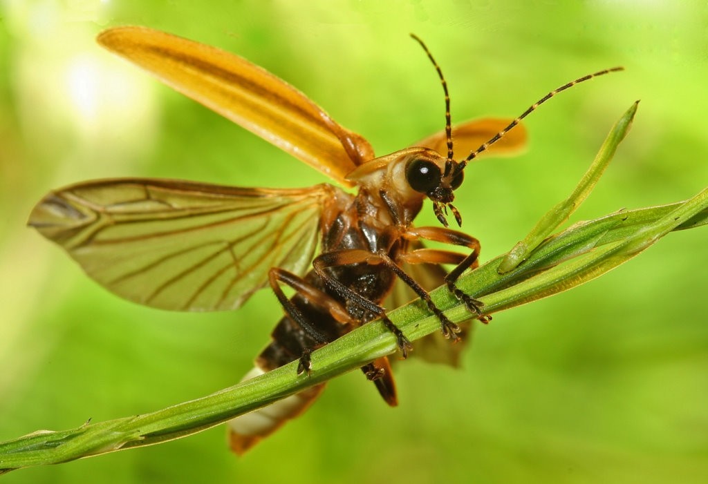 A firefly. Did you know that each species of firefly has its own flash pattern? That the questing males flashing in the meadow are being responded to by females flashing in the tall grass? That certain predator fireflies are also hiding in the tall grass, mimicking female flash patterns and luring amorously-intentioned males in so they can eat them?