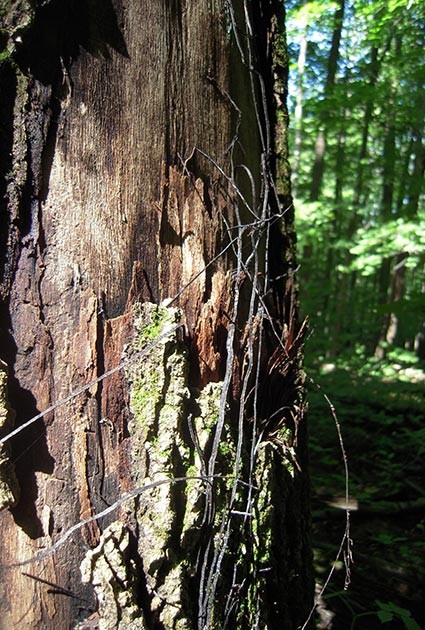What are these wire-like objects that have been exposed from beneath the bark of this dead ash tree?