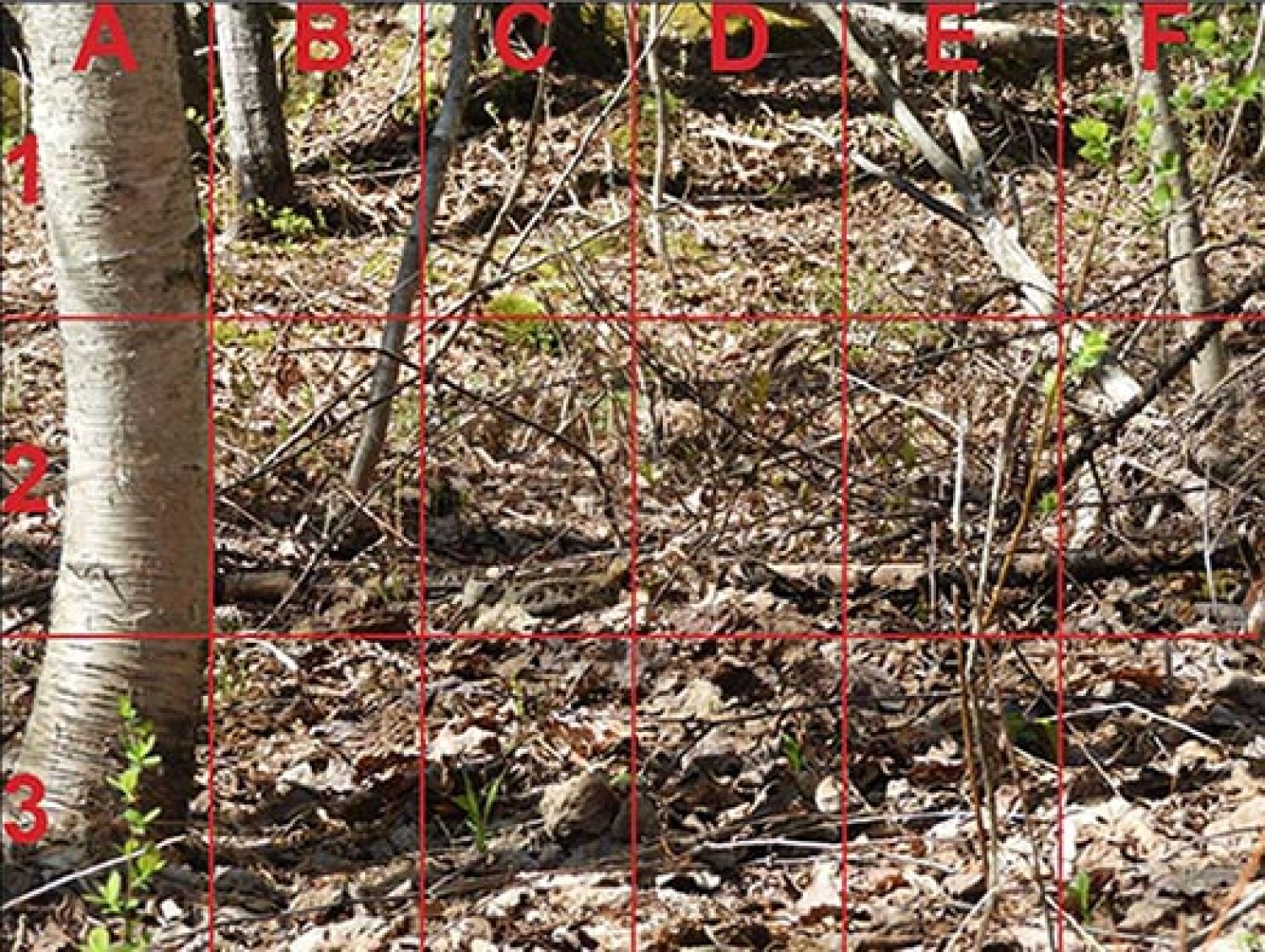 This time we have a cross between Where’s Waldo? and Battleship. There’s a woodcock nesting in this photo by Sandy Dannis. Can you tell us which box (number/letter) it’s in?
