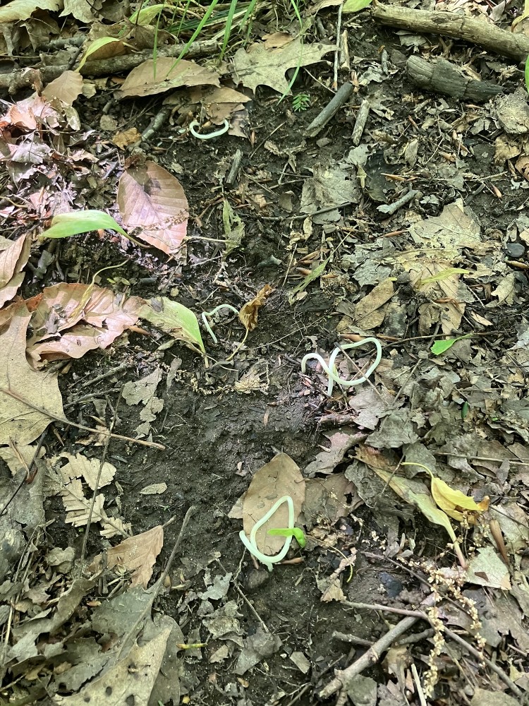These are trout lily runners, the horizontal stems that allow the plant to spread vegetatively. Runners emerge from corms and the other end, called the “dropper,” re-enters the soil to grow into a new corm, which will grow into another trout lily in the future!