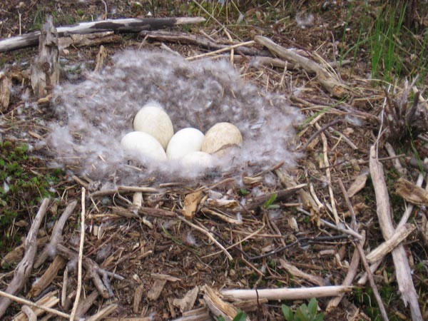 A Canada goose nest. Canada geese usually nest on the ground, and their nests are festooned with light-colored down and body feathers. Wild turkeys have similarly-sized eggs, but their nests aren’t lined with down. Look closely and you’ll see that some nearby branches had been nibbled on by a beaver, a hint that water is nearby. Females incubate 3-8 large, creamy white eggs (another helpful ID) for about four weeks while the male stands guard.