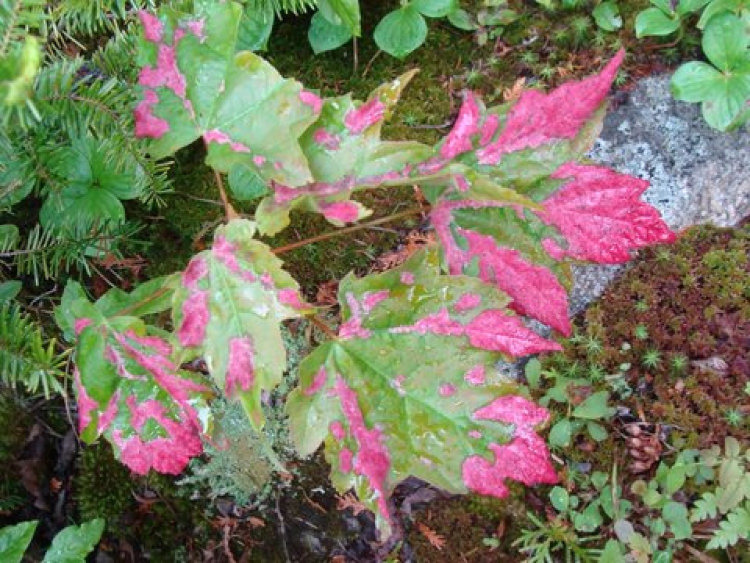 The pink, felt-like patches on these maple leaves are damaged areas known as erineum galls, caused by eriophyid mites. The patches are most noticeable in the spring and, while it may look alarming, mite activity decreases over the summer and they don’t harm the tree.